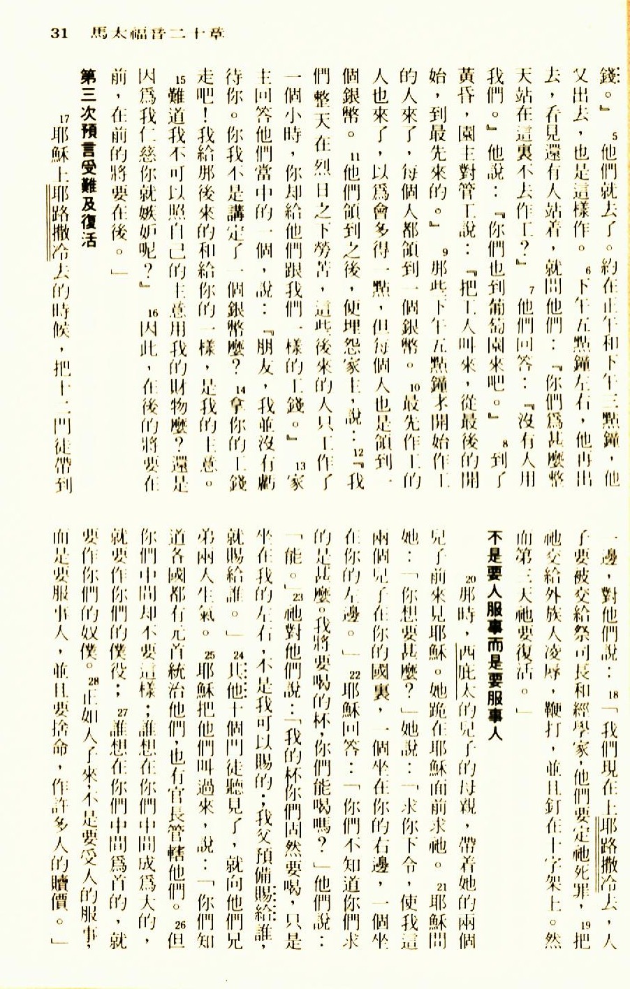 1976年圣经新译本新约 马太福音 20 章 5 节到 20 章 28 节
