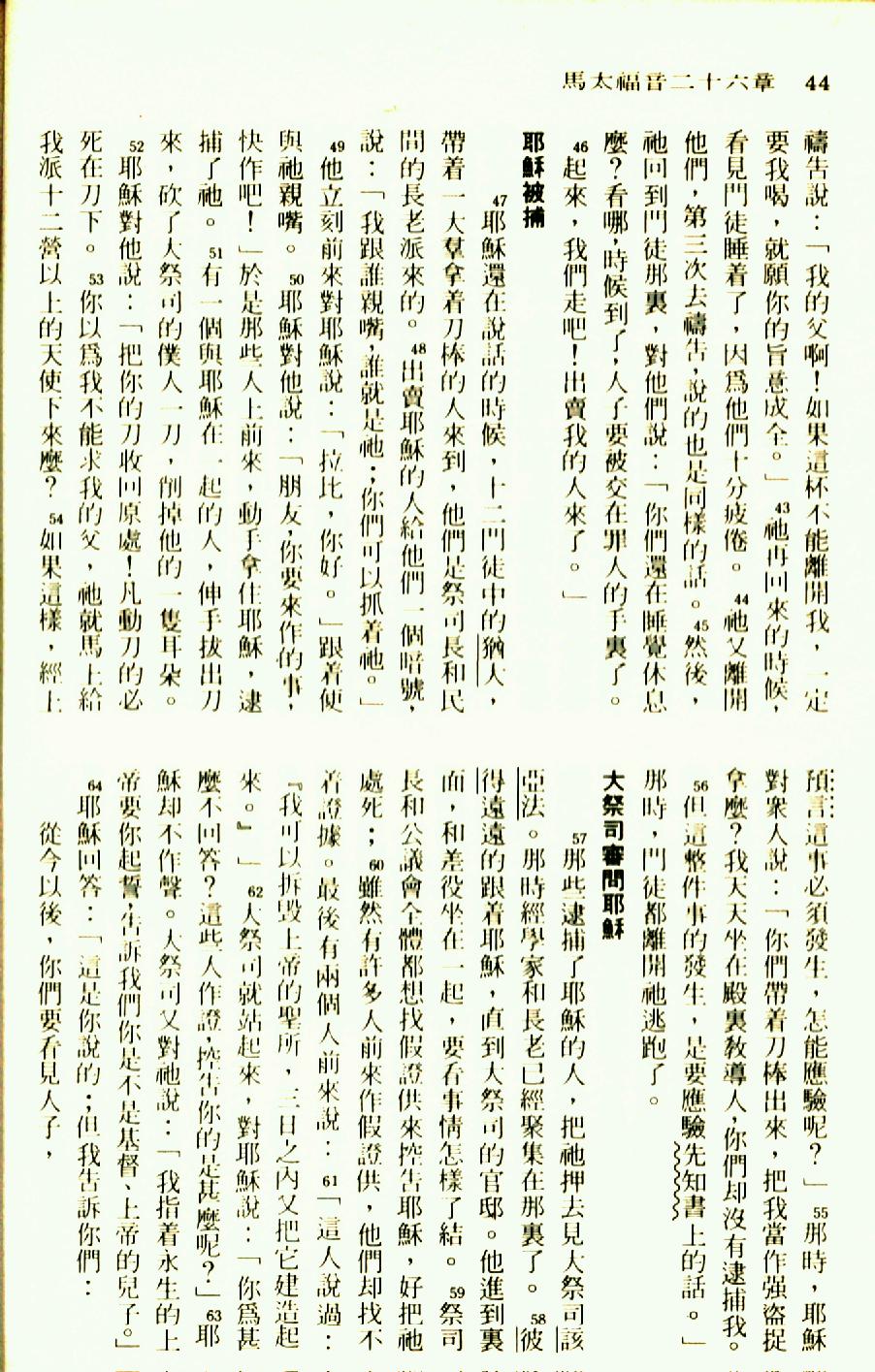 1976年圣经新译本新约 马太福音 26 章 43 节到 26 章 64 节