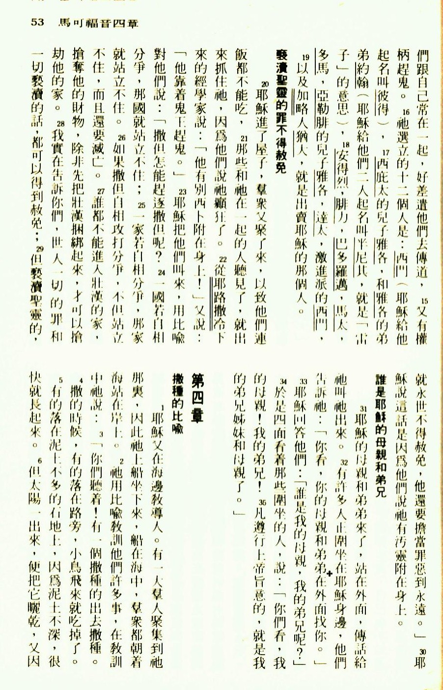 1976年圣经新译本新约 马可福音 3 章 15 节到 4 章 6 节