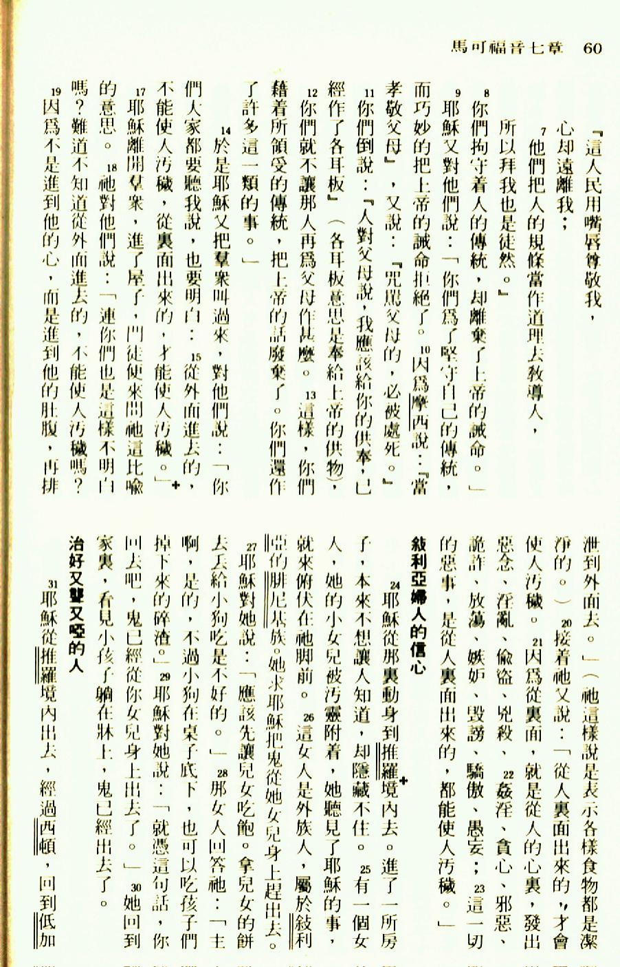 1976年圣经新译本新约 马可福音 7 章 7 节到 7 章 31 节