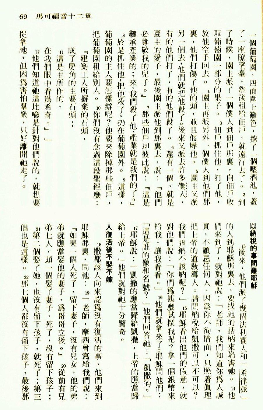 1976年圣经新译本新约 马可福音 12 章 2 节到 12 章 22 节