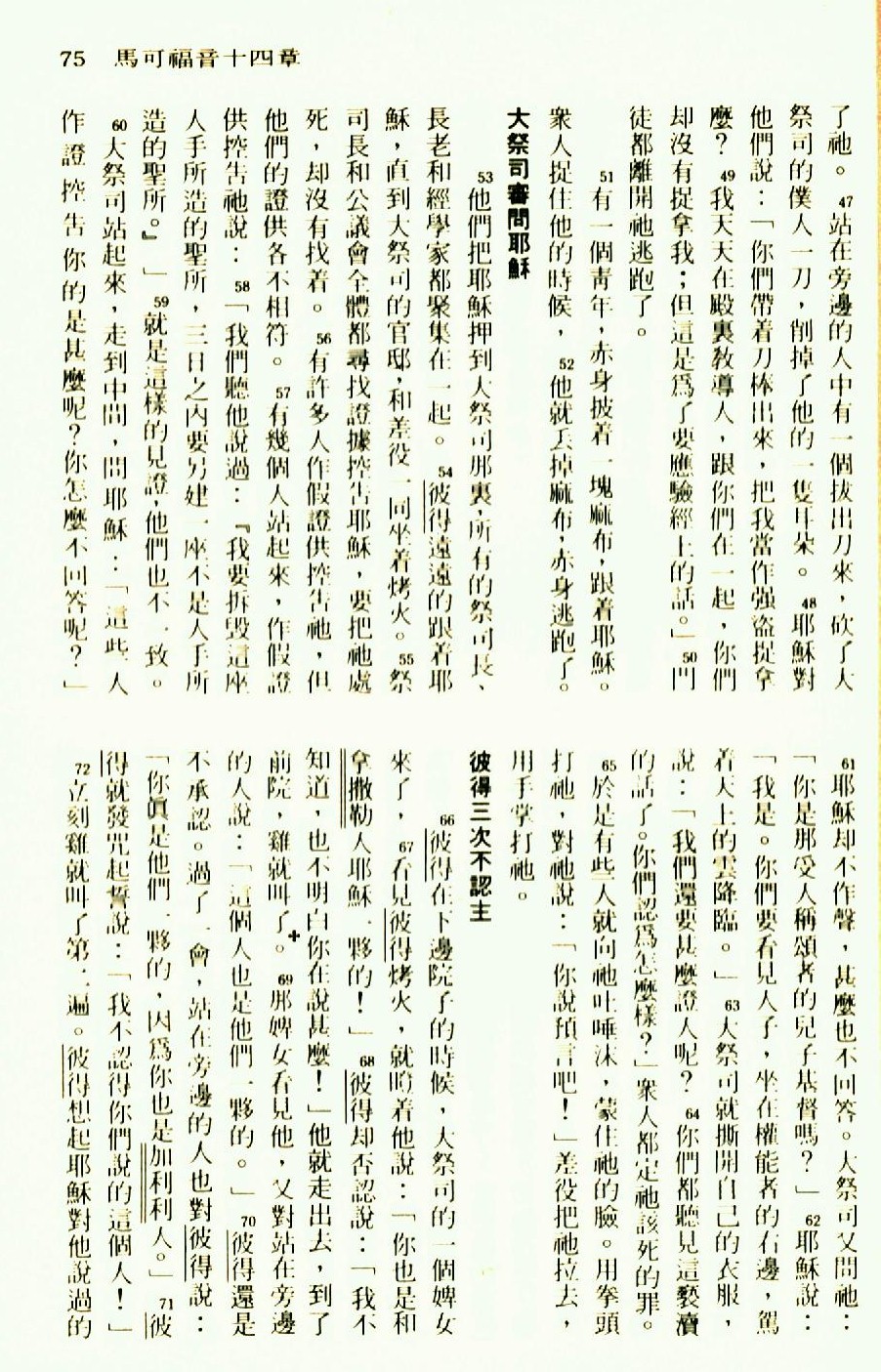 1976年圣经新译本新约 马可福音 14 章 47 节到 14 章 72 节