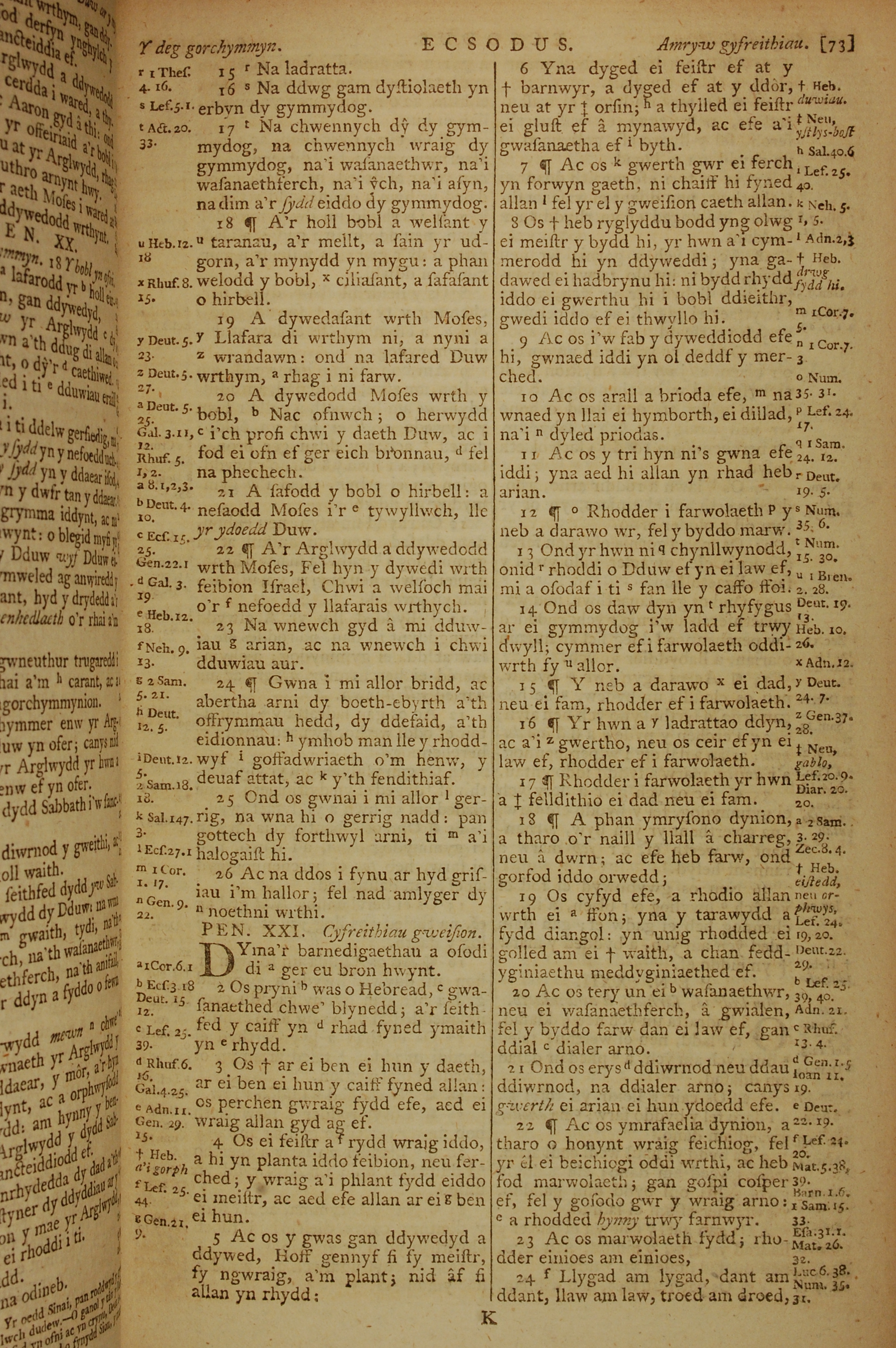 1796年威爾斯文新舊約全書 出埃及記 20 章 15 節到 21 章 24 節